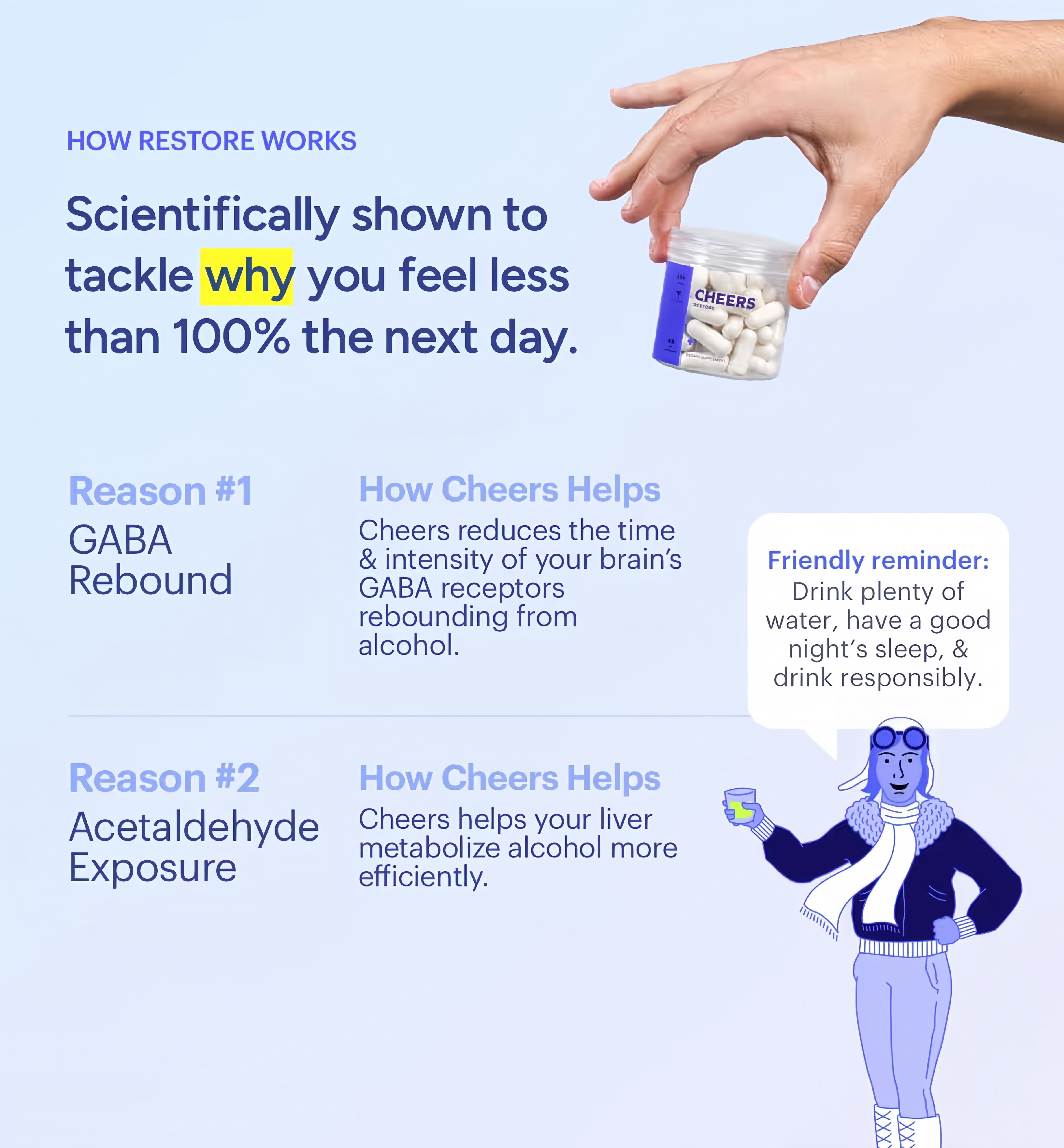 If you don't know when your last drink will be, you can simply take Restore before going to bed. We know it’s a tough thing to remember the first time, but once you take Cheers and wake up feeling better, we’re sure you’ll want to make it part of your routine! 😄